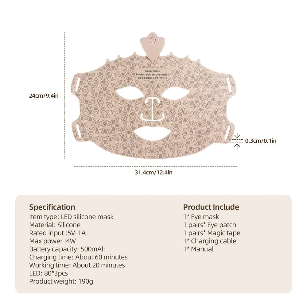 - Includes: LED mask, eye patches, velcro straps, charging cable, manual